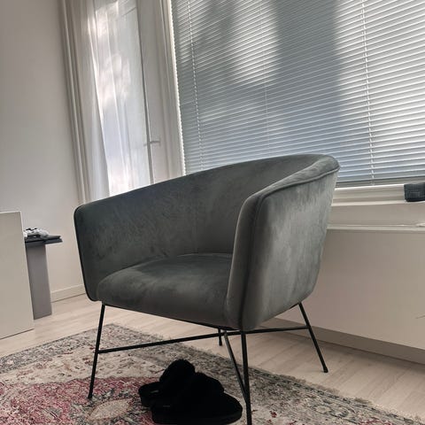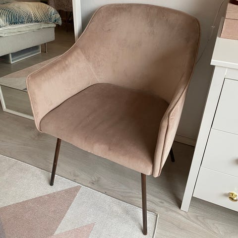 Myyntiin kaunis ja selkeälinjainen, hempeän vaaleanpunainen nojatuoli. Istuinosassa pientä painaumaa ja muutamat jäljet kankaassa.