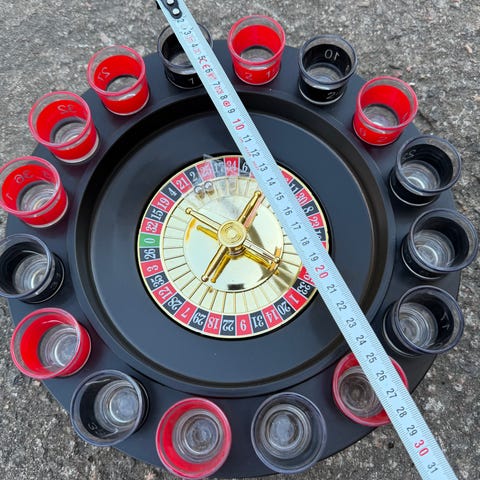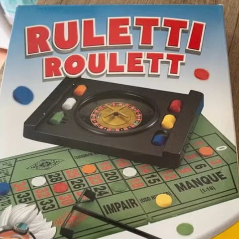 Rulettipeli pöytäpeli. Paketissa näkyy rulettipyörä, pelilauta numerokentällä sekä pelimerkkejä. Sopii ajanvietteeksi useammalle pelaajalle. Tarkemmat mitat, materiaalit ja valmistaja eivät käy ilmi kuvasta.
