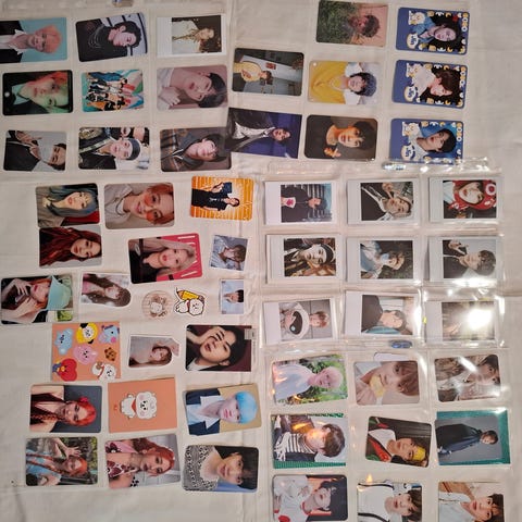 Myynnissä kpop kuvakortteja. Illit Iroha (Super Real Me ja I'll Like You -albumeista), IVE Liz (I've Mine -albumista), Purple Kiss Swan (Memem-albumista.