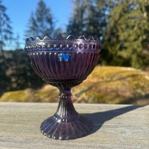 Vanhaa tuotantoa oleva lila Mariskooli. Pohjassa ei ole Marimekon stanssia eikä tarraa. Korkeus noin 15,3 cm. Lasimassassa on pari ilmakuplaa (näkyvät kuvissa).
