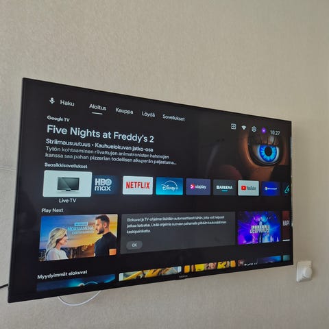 Toshiba A7D63DG 65 tuumainen 4K QLED Android televisio. Ostettu 15.4.2023. Paneelissa pientä värivikaa oikeassa yläkulmassa. Näkyy parhaiten kirkkaissa kuvissa ja tummissa lähes olematon. Ei kuolleita pixeleitä. Android tvn apit ja sisäinen Chromecast. Nopeimmalle hakijalle. Kuitti mukaan.