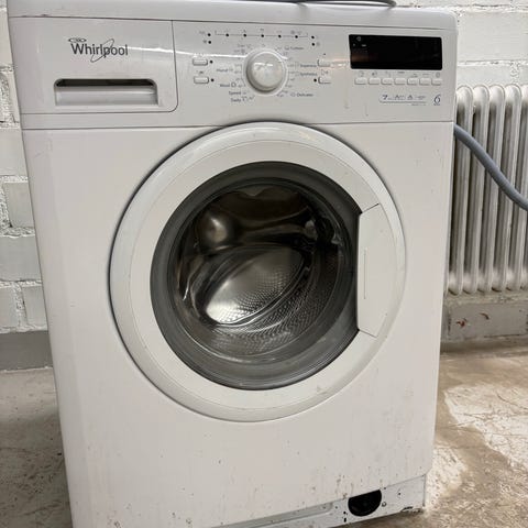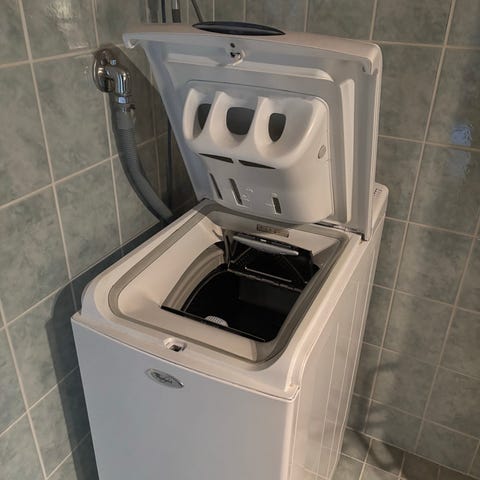 Whirlpool päältä täytettävä pesukone valkoisella viimeistelyllä. Pesukoneessa on ylhäältä avattava kansi ja rumpu, johon pyykit asetetaan yläkautta. Ohjauspaneelissa on useita pesuohjelmia eri tekstiilityypeille sekä digitaalinäyttö, josta näkee ohjelman asetuksia ja jäljellä olevan ajan. Pesuainelokero sijaitsee kannen alla. Laite soveltuu pyykinpesuun kotitalouskäytössä tiloissa, joissa kapea ja päältä täytettävä malli on käytännöllinen ratkaisu.