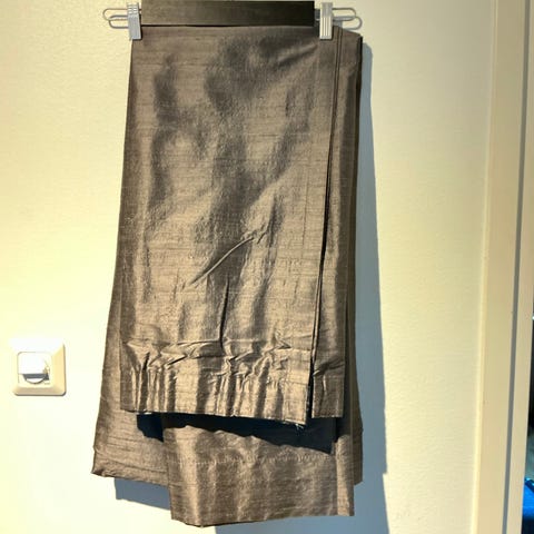 Silkkiverho, raidallinen-vaalea beesraita 8cm, tummempi raita 8cm. 1 kpl. Koko 122x210cm. Ollut verhotangossa ja siksi yläreuna hieman ryppyinen. Muuten en näe mitään virheitä.