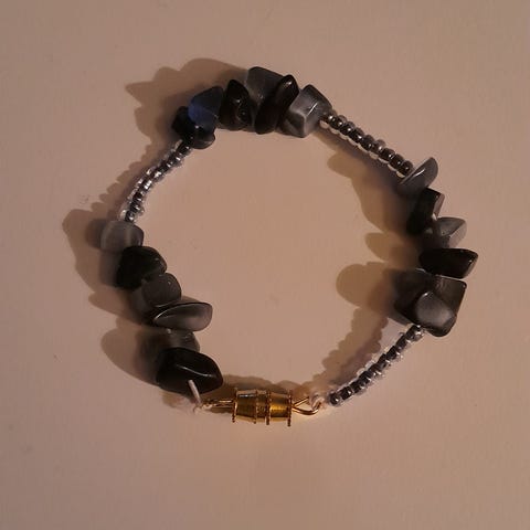 Naisten rannekoru, jossa useita turkooseja nahkanauhoja ja hopeansävyisiä metalliyksityiskohtia.