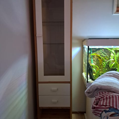 Ikean pitkä vitriinikaappi, pienillä hyllyillä. Mitat 200x40x20cm.