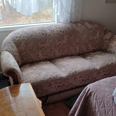 Hyvä kuntoinen iso sohva kaarevalla kulmalla. Kankaat irroitettavat ja pestävät. Kätisyys on vaihdettavissa.