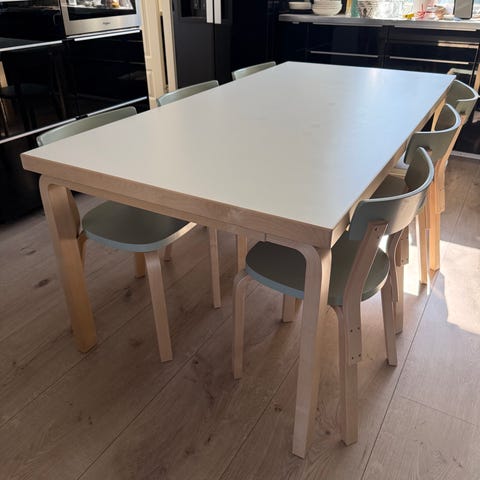 Myyn Alvar Aallon suunnitteleman massiivikoivuisen ruokapöydän. Kannen pinta ja väri koivuviilua. Jalkojen materiaali lakattu luonnonvärinen koivu. Ostettu syksyllä 2021 Finnish design shopista. Hyvä kunto, normaalia käytön jälkeä. Yhdessä kohdassa pöydän kannessa noin 3,5cm:n kokoinen pieni pintalakan irtoama, jonka todennäköisesti saa paikattua varovaisella lakan lisäämisellä ko. kohtaan (ks. kuva).