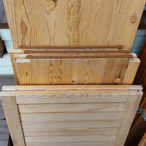 Kuvan mukaisia vanhoja ja patinoituneita Lundia-hyllystön hyllytasoja 4 kpl. Mitat 30 cm x 100 cm. Hinta 15 euroa kappale.