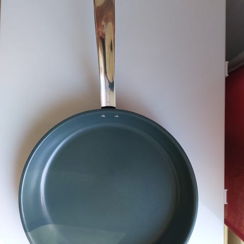 Fiskars All Steel paistinpannu keraamisella Ceratec -non-stick-pinnoitteella. Jonkin verran käytön jälkeä pinnoitteessa mutta käyttökelpoinen edelleen.
