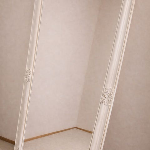 AmandaB collection kokovartalopeili valkoisella kehyksellä. Peili on kapea ja korkea, sopii hyvin esimerkiksi makuuhuoneeseen tai eteiseen pukeutumispeiliksi. Peiliä voi käyttää seinää vasten nojaavana tai tukeutuvalla jalustalla vapaasti seisovana peilinä, kuten kuvissa näkyy. Valkoinen kehys sopii monenlaiseen sisustukseen ja tuo tilaan lisää valoa ja avaruutta.