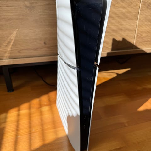 Erittäin tyylikäs Laser Flashbang värinen PS5 -konsoli levyasemalla. Konsoli taittaa valossa tyylikkäästi eri värejä. Vaikea saada kuviin, livenä upea.