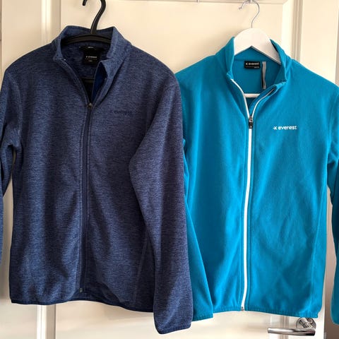 Vaalean sinisen fleecetakin kokomerkintä on 160 cm. Takki käy hyvin esimerkiksi väliasuksi lasketteluasun alle.