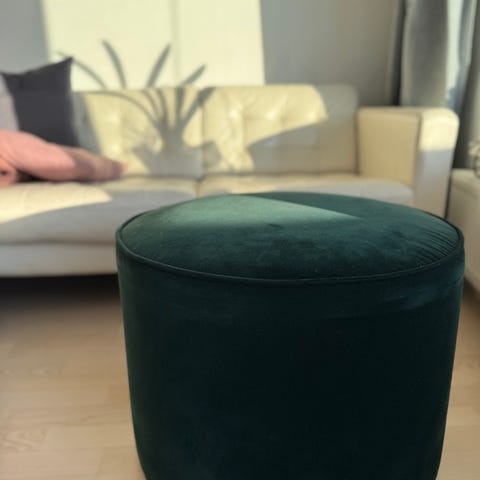 Sininen samettinen säilytysrahi, tikattu kansi nappidetaljeilla, hopeiset niittikoristeet ja puiset jalat. Avautuu sisäiseen säilytystilaan. Toimii jalkarahina, lisäistuimena tai sisustuselementtinä.