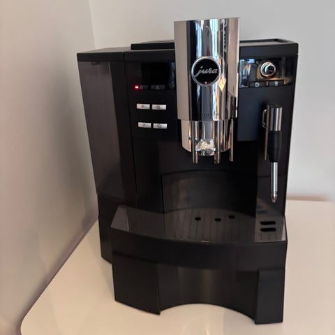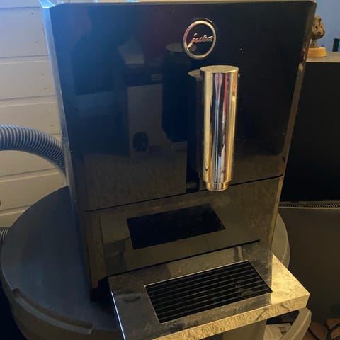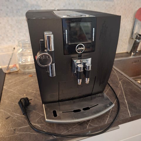 Hyväkuntoinen mutta käytetty Jura Impressa F50 kahviautomaatti. Täysautomaattinen espressokeitin, Laitteessa on erillinen höyry- ja kuumavesisuutin esimerkiksi maidon vaahdotukseen. Etupaneeli on musta ja sivut harjattua terästä. irrotettava vesisäiliö. Mukana käyttöohje, jossa mallitiedot Impressa F50 / F5 / F505. Soveltuu espresson, kahvin ja maitokahvijuomien valmistukseen kotikäytössä.