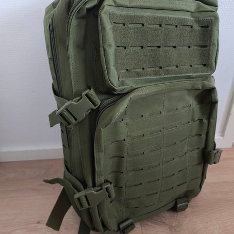 Taktinen 28L reppu. Repussa on useita vetoketjullisia lokeroita ja taskuja sekä edessä ja sivuilla molle-kiinnityspaneelit lisävarusteiden kiinnittämistä varten. Sivujen kompressiohihnat auttavat säätämään tilavuutta ja pitämään sisällön paikallaan. Olkahihnat ovat pehmustetut ja säädettävät, ja selkäosassa on pehmuste käyttömukavuuden parantamiseksi. Reppu soveltuu esimerkiksi arkeen, retkeilyyn tai muuhun ulkoiluun, kun tarvitaan useita lokeroita ja järjestelymahdollisuuksia varusteille.