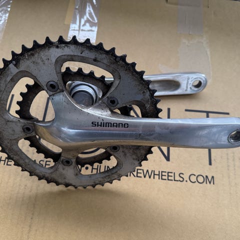 Polkupyörän kampisarja, vaihteettomaan tai napavaihteiseen pyörään eli tavalliselle leveälle ketjulle. Uusi, mutta hampaista viilattu maalit pois, kun yritetty, saisiko kapeaan ketjuun toimimaan. Oli silti liian leveä eikä mennyt vaihdepyörään, joten jäi käyttämättä. Kiinnitys nelikulma-akselille (square taper). Pituus 152mm, hampaita kuvasta laskien 33 tai 34. Pientä pintaruostetta viilatussa pinnassa varastoinnista, mutta ei ole ollut ajossa.