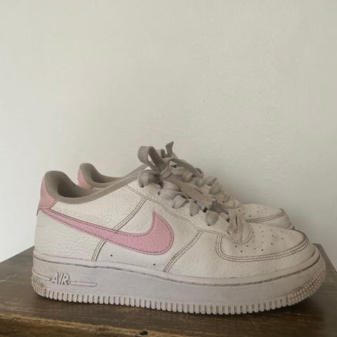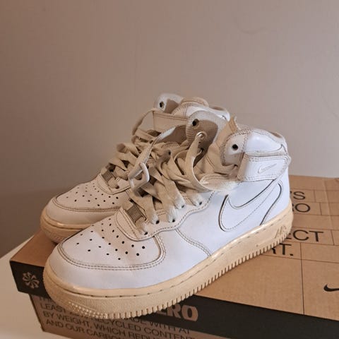 Nike Air Force 1 tennarit, koko 38.5. Väriltään mustat, valkoisella pohjalla. Materiaalina päällisosassa synteettinen nahka ja tekstiili, sisäosassa tekstiili ja kumipohja. Nauhakiinnitys. Kengän sisäsyrjän kantapäävuorissa näkyvää kulumaa ja repeämää, jotka näkyvät kuvissa. Soveltuvat arki- ja vapaa-ajan käyttöön.