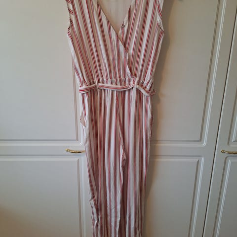 Mango naisten jumpsuit, kuin uusi. Laskostuva istuva malli. Jumpsuitissa on pitkät lahkeet ja hihat ja V-pääntie. Edessä on solmittava nauha, joka kiinnittyy vyötärölle. Takana on vetoketjukiinnitys. Sopii käytettäväksi esimerkiksi arki- tai juhlapukuna. Nouto Länsi-Patela.