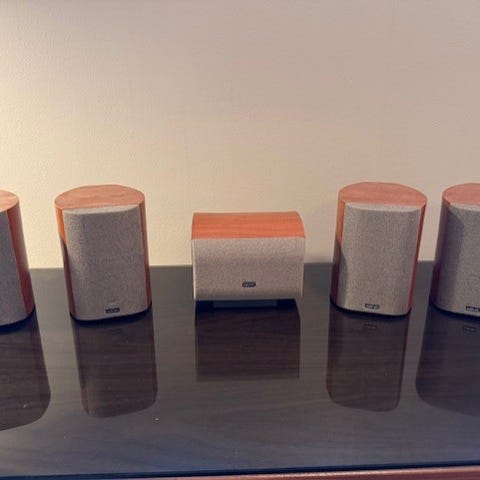 Audio Pro kotiteatterikaiutinsetti, jossa etu-, taka- ja keskikaiuttimet ja subwoofer. Kaiuttimissa on puuviimeistelty kotelo ja takaliitännät. Setti soveltuu kotiteatterikäyttöön ja tv-äänen parantamiseen olohuoneessa tai mediahuoneessa. Mukana johtoa ja 4 seinäkiinnikettä ruuveineen. Vain nouto Espoosta
