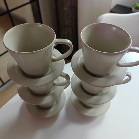 Hyvän kokoiset kahvikupit ja aluslautaset kesän juhliin. Tilavuus 13cl. Yhteensä noin 40 settiä, voidaan laskea tarkemmin hakiessa. Hinta/setti
