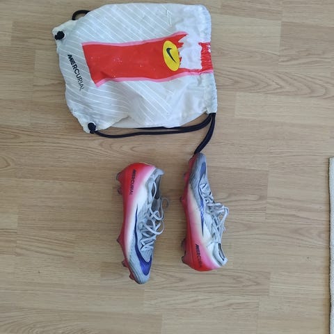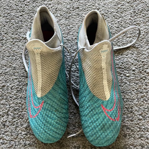 Nike Phantom GT jalkapallokengät nappulakengät mintunvihreällä päällisellä ja punaisilla logoilla. Kengissä on nauhakiinnitys ja korkea kaulus, joka tukee nilkkaa. Pohjassa on nappulat luonnonnurmelle tai keinonurmelle. Soveltuvat jalkapallon pelaamiseen ulkokentillä. Hieno AI-kuvaus mutta pitää paikkansa. Todella vähän käytetyt.koko 36