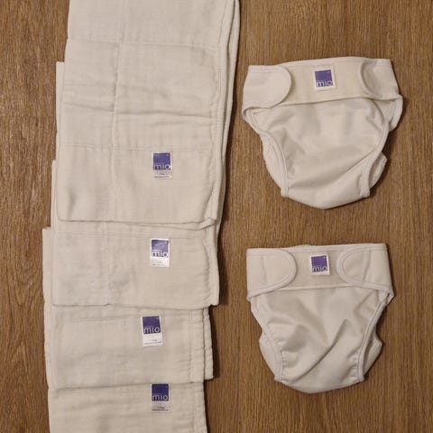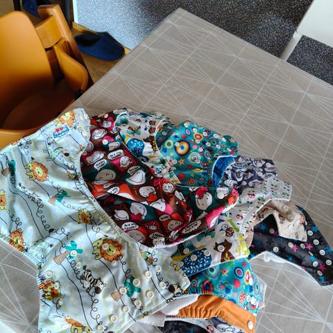 Hyvä setti kestovaippoja, kaikissa imut sisällä. Ja esim harsosta voi taitella lisuketta jos tarvitsee. Liberon laukku mukaan. Koko S-M, 5-10 kg kokoiselle. Kahdessa myös säätönapit niin sopii pidempään.