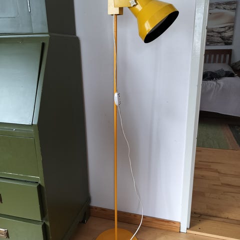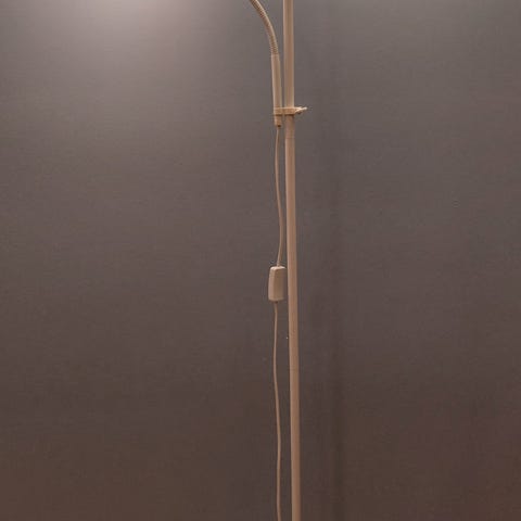 Lattiavalaisin, jossa on messinki jalka ja vaalea varjostin. Varjostimessa on koristeelliset hapsut, jotka tuovat lisäilmettä valaisimeen. Lampun jalassa marmori/kivikoristelu. Edelleen hyväkuntoinen ja toimiva. 70-lukua.