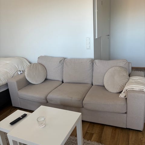 Siistikuntoinen vaalea / beige kolmen istuttava sohva. Istumakorkeus n. 34cm ja istumaleveys n. 178cm.