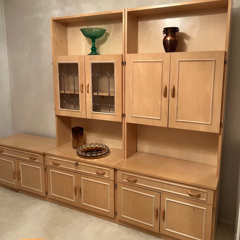 Leveimmästä kohdasta 120.5cm, syvyys leveimmillään 47.5cm ja korkeus 179cm ja tallella on kirjahyllyn yläreunaan tulevat koristelistat. Ne saa mukaan myös jos haluaa.
