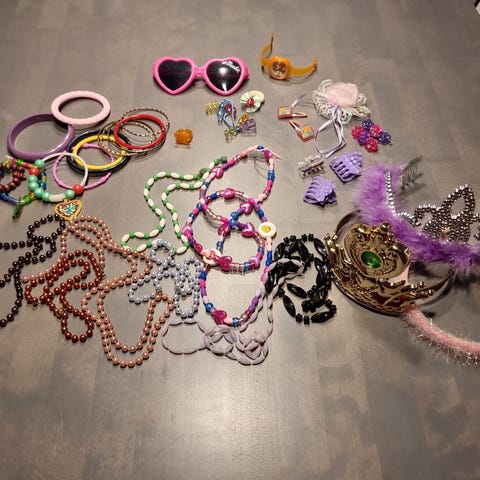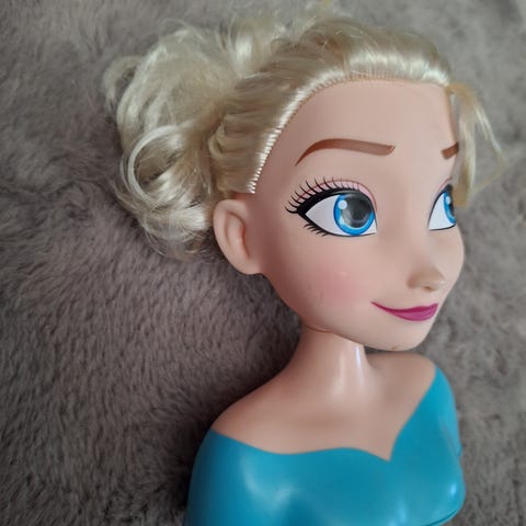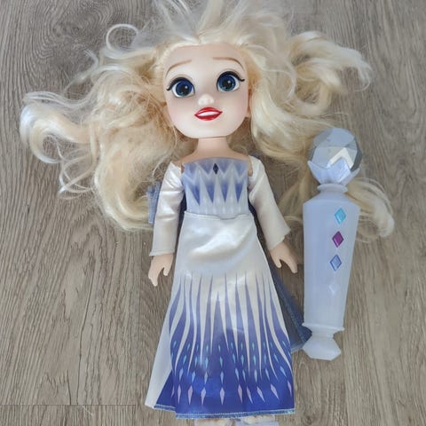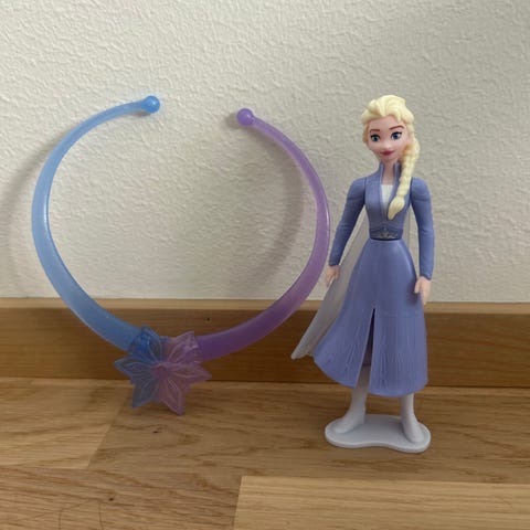 Kolme kruunua, joista strasseja jo irronnut. Frozen Elsa taikasauva, joka soittaa Frozenin tunnaria ja pyörittää valojen kera yläosan propellia.
