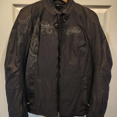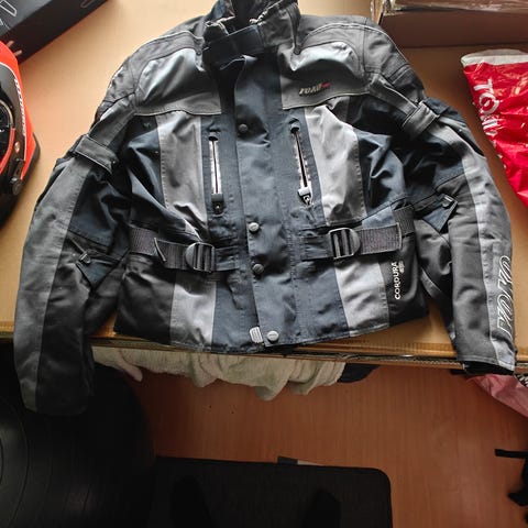 Yoko Formoto moottoripyörätakki sekä -housut, koko 2XL (56). Takissa on musta ja vaaleansininen väritys. Päällikangas on valmistettu polyamidista ja polyuretaanista, vuori ja eriste polyesteristä. Takissa on etuvetoketju ja useita vetuketjullisia taskuja. Suunniteltu moottoripyöräilyyn ja muuhun ajokäyttöön, tarjoaa suojaa (kyynär-, olka- ja polvisuojat sekä selkäpanssari) ja näkyvyyttä ajon aikana. Hoito-ohjeiden mukaan konepesu 40 °C, pesu erillään ja suojien poisto ennen pesua.