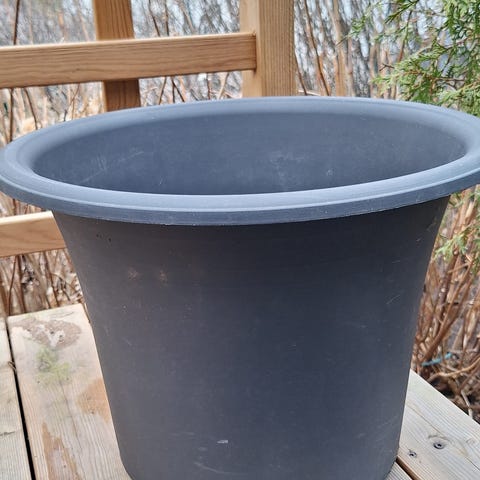 Harmaa ulkoruukku. Korkeus 27 cm, halkaisija 29 cm.