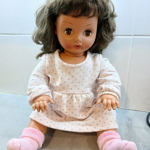 Kauniskasvoinen kovamuovi nukke. Pituus noin 65 cm. Päällä on lasten kokoinen mekko. Kaipaa vaan lisää vaatteita.