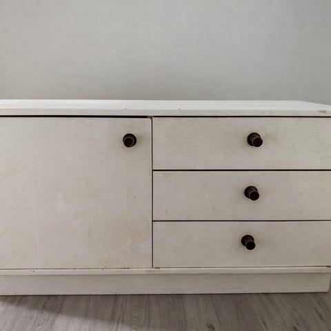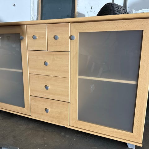 Massiivipuinen lipasto, käytön jälkiä ja toinen ovi sekä takaseinä puuttuvat. Muutoin siisti, kuvien mukaisessa kunnossa.