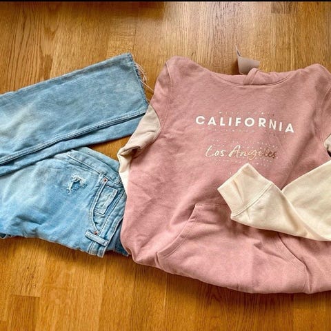 Puma huppari koko 158. Väri valkoinen, edessä iso Puma-logo. Hupussa kiristysnyörit joista toisesta pää lähtenyt ja edessä kengurutasku. LMTD-merkkiset farkku, koko 13 xs/s vastaa noin 158cm. Kunnoltaan molemmat hyviä käytettyjä, huppari hiasssa jotain tummia pisteitä joista kuva.