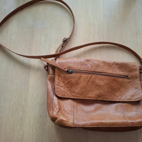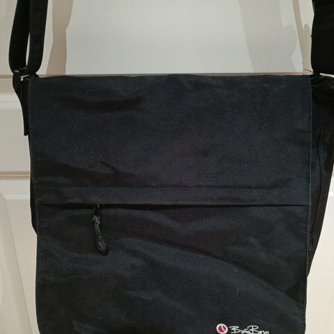 Musta olkalaukku, sisällä 3 erillistä lokeroa ja useita pieniä taskuja. Vetoketjulliset taskut edessä ja sisällä. Laukun leveys n. 34 cm ja korkeus n. 24 cm. Hihnan pituus n. 50cm.