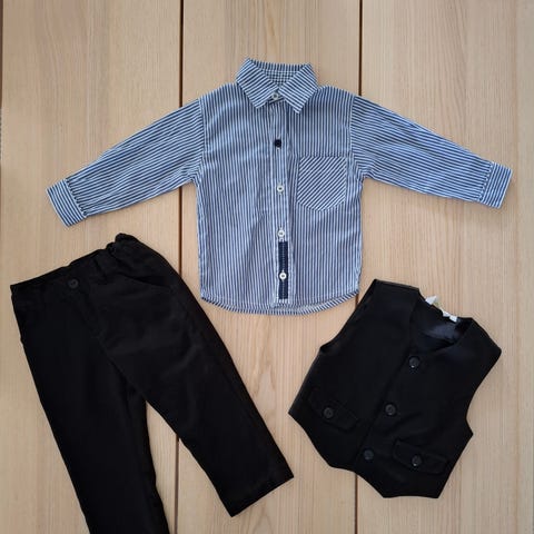 Polarn O. Pyret poikien paita, koko 92. Materiaali on puuvillaa. Valkoinen pitkähihainen kauluspaita, jonka päällä musta liivi. Paita sopii noin 1,5–2-vuotiaalle lapselle. Liivi on erillinen vaate, jonka merkki on H&M.