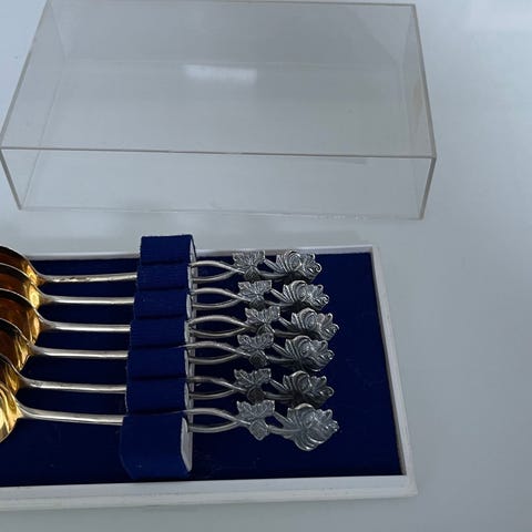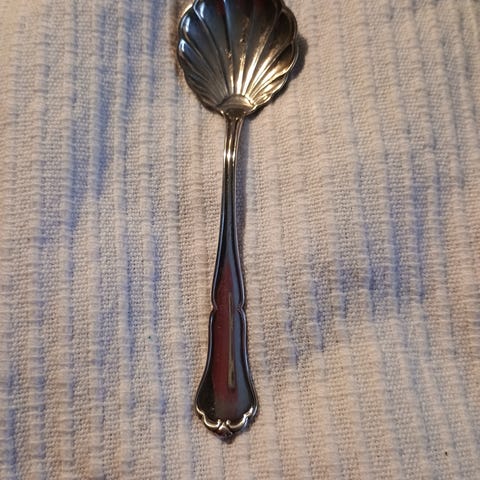 Hopeisen sokerilusikan pesä ollut joskus kullattu, kultaus kulunut pääosin pois. Hopean pitoisuus 813H. Varressa kaiverrukset Saimi ja takana päivämäärä.