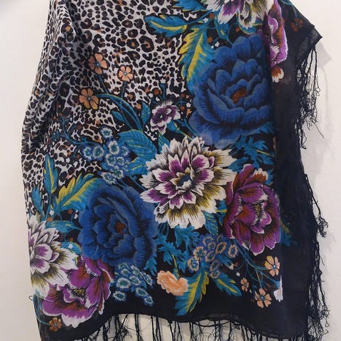 Lindex naisten huivi, materiaali polyesteri. Huivissa on kirjava kukkakuviointi ja reunuksissa tummat kehykset. Sopii käytettäväksi kaulahuivina, hartiahuivina tai asusteena esimerkiksi takin tai neuleen kanssa. Koko noin naisten L, mitoitus runsas ja laskeutuva polyesterikangas.