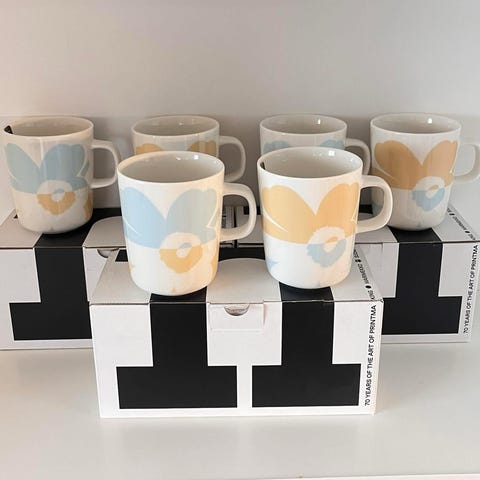 Marimekko mukit Unikko-kuosilla. 12kpl. Tilavuus 2,5dl. Beige-valkoiset mukit. Sopivat arki- ja kahvikäyttöön sekä kattauksiin. Myydään kuvissa näkyvänä settinä. Mielellään vain nouto.