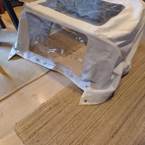Fasterin kuomu. On ollut n. 10 vuotta käytössä. Pieni reikä kulkuvalon kohdalla. Ikkunat rikki, vaatii korjausta. Vaatii pesua. Kuomua on mahdollista käyttää aurinko ja sadesuojana ilman ikkunoita. Huom. Myydään ilman kaaria. Lähetys onnistuu. Hinta noin kymmenesosa uudesta.