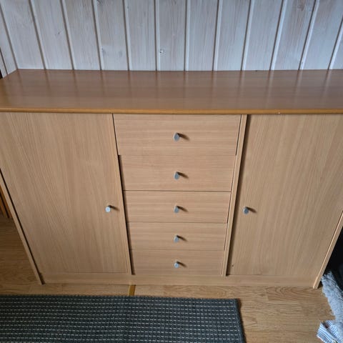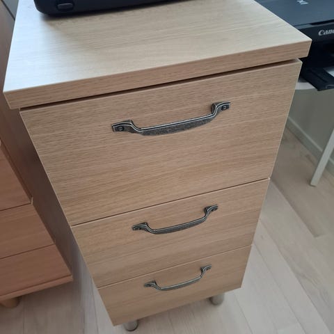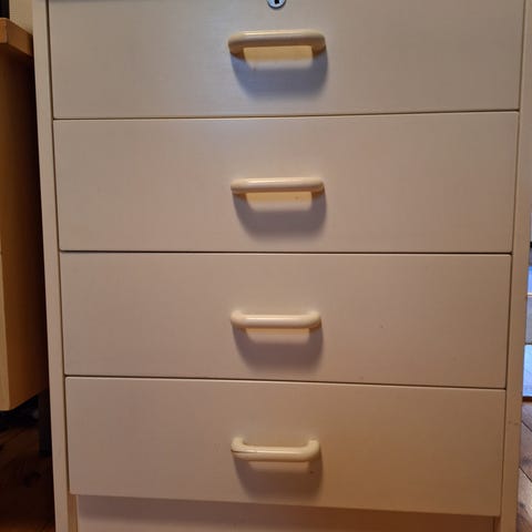 Noudettavissa laatikosto. Pääväri valkoinen, listat keltaiset ja vetimet metallinväriset. Laatikot saa lukittua.