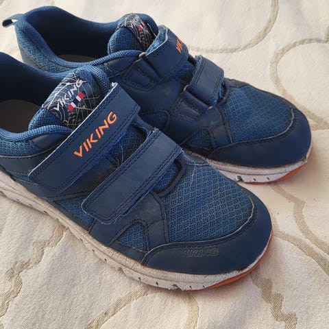Viking poikien kengät, koko 35/36. Väri tummansininen, vaalea kumipohja. Kengissä on kaksi tarranauhaa kiinnitystä varten. Sisämitta 20cm. Nouto Lintuvaara Espoo.