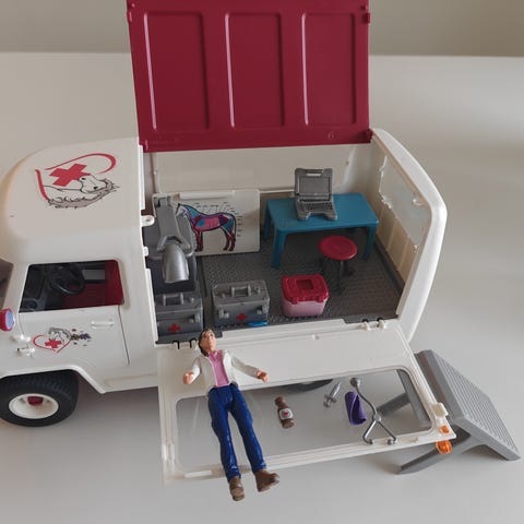 Kuvan mukainen ambulanssi, kaksi lääkäriä ja varsa.