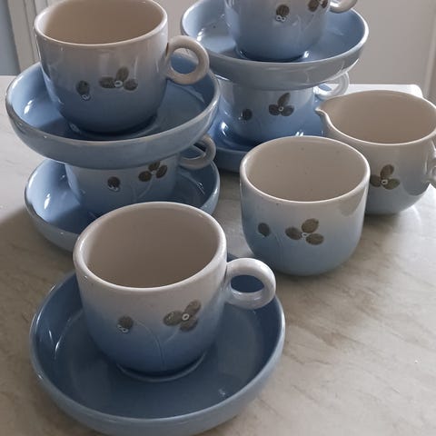 Juustokupu ja seitsemän kahvikuppia, hyvässä kunnossa.