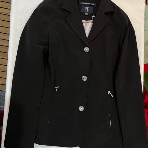 Equipage Competition Wear ratsastustakki, koko 152 cm. Väri musta. Sopii nuorelle ratsastajalle kilpailu- tai harjoituskäyttöön. Pesty aina käytön jälkeen, valoa vasten näkyy joitakin tahroja, mutta eivät juurikaan näy käytössä. Kisatakki.