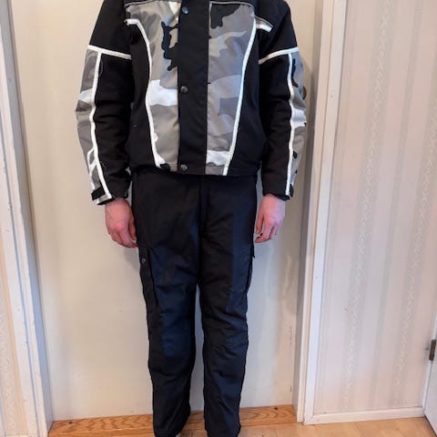 Käytetty, mutta edelleen hyvässä kunnossa oleva mp-asu. Takin koko 42, housuissa merkintä ss/48s.