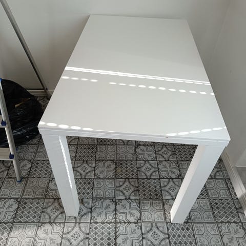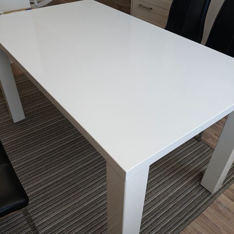 Kiiltävähkö (ei korkeakiilto) valkoinen 120x120 cm ruokapöytä. Toki käytön jälkiä on, mutta ihan ookoo-siisti. Luonnollisesti vain nouto, kun ei tuota jaksa alkaa pahvilaatikkoon murjomaan.