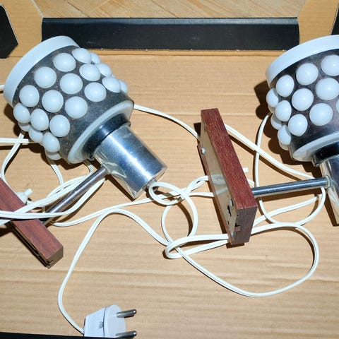 Myydään näyttävä ja harvinaisempi Livalin (Made in Finland) vintage seinävalaisinpari 60–70-luvulta. Tyylikäs kokonaisuus, jossa yhdistyy messinki ja kauniisti valoa taittavat kristalliprismat – luo upean, lämpimän tunnelman tilaan.