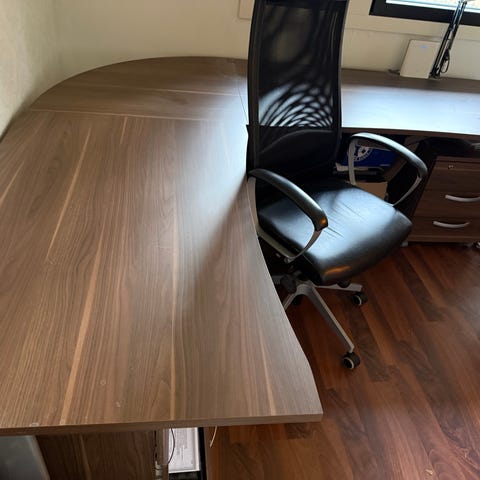 Toimistomallinen työpöytä, yksi laatikko arkistokansioille, yläpuolella kapealaatikko. Toisella puolella neljälaatikkoa, laatikoiden syvyys 60cm